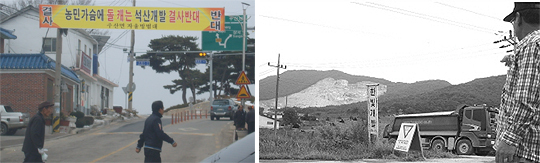 배멧산 석산개발로 인해 12년 가까이 소음·진동·먼지 등으로 고통을 받고 있는 부안군 주산면 주민들이 새로운 업체의 토석채취 허가 신청에 대해 반대하는 현수막(왼쪽 사진)을 내걸고 있다. 현재 토석을 채취하고 있는 2개의 석산개발업체가 채취 허가면적을 확대 신청 할 당시 본보(지난 2009년 7월 8일)에 보도된 현장 모습. 홍동기(hongdk@jjan.kr)