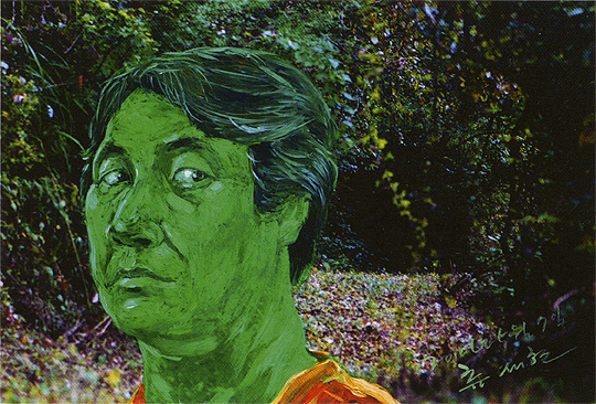 낙엽 지는 가을 보다는 여름의 실록을 사랑한다. 이양하의 '실록예찬'에 가깝다. 새로운 경이를 가져오는 언덕이나 하늘을 달리고 녹음을 스쳐오는 맑고 향기로운 바람. 숲길에서는 이 모든 것을 만난다. 내가 숲길에 매료되는 이유다. 자화상 얼굴을 녹색으로 칠한 것도 내가 주로 쓰는 색이어서다. 숲 속을 바라보는 나의 모습은 결국 숲과 내가 하나가 되는 모습. 녹색은 숲 속 생명의 기운을 드러내는 데 적합하다.