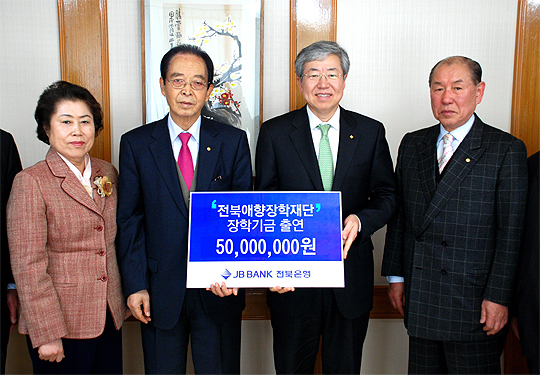 전북은행 김한 은행장은 17일 전북애향장학재단(이사장 임병찬)을 방문, 가정형편이 어려운 지역학생 육성 및 우수인재 발굴에 써 달라며 전북애향장학기금 5000만원을 전달했다.