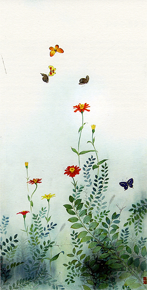 예원예술대 조형미술학과에서 한국화를 전공한 유기준(36) 조계환(28)씨. 8년 선·후배인 이들은 유씨가 미술학원 강사 시절 선생님과 제자로 만났고, 현재는 매부 처남으로 한솥밥을 먹는 가족이다. 두 남자가 1년 이상 같은 작업실에서 작업을 살면서 꽃과 나비를 화려한 화폭에 담은 공필화 30여 점을 선보인다. 공필화는 작은 붓을 이용해 치밀하고 정교하게 공을 들여 사물을 채색해나가는 그림이다. 공필화는 주관적 판단으로 본질을 왜곡하거나 방만한 실험성으로 미(美)의 선을 넘어버리는 작품들과는 달리 객관적이고 감정이 배제된 것이 특징.