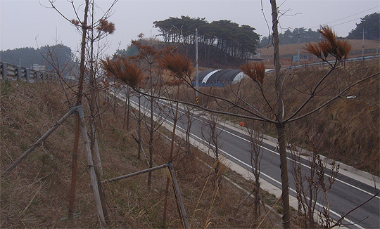 2009년말 부안 변산우회도로 운산교차로변에 심어진 잣나무 등의 잎이 메말라 갈색으로 변하는 등 조경수들이 고사하고 있는 모습. (desk@jjan.kr)