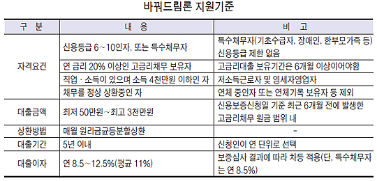 바꿔드림론 지원대상은 신용등급이 6등급 이하이고 연소득 4000만원을 넘지 않아야 하며 현재 연체가 없어야 한다. 대출금액은 대출받은 후 6개월이 경과하고 연 20%를 초과하는 고금리대출 원금을 한도로 1인당 3000만원까지이다.