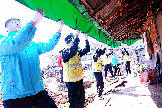 이날 봉사활동은 홀로 외롭게 사는 박 씨의 지붕이 낡아 주산면사무소에서 천막을 구입, 지붕 씌우기 작업을 벌이기로 했으나 인력이 부족해'파랑새봉사단'에 도움을 요청해 이뤄졌다.
