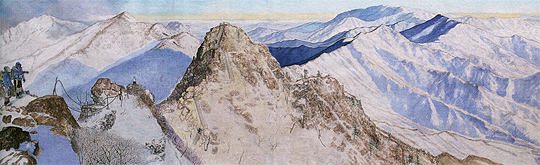 특히 웅장한 산세를 표현한 '덕유-산에서 길을 묻다'와' 대둔산-옛 일을 기억하다'는 가로 4m가 넘는 작품으로 작업하는데 꼬박 3개월이 넘게 걸렸다. 높은 곳에서 낮은 곳을 조망해 깊이와 넓이가 두드러지는 화면이 파노라마처럼 펼쳐진다.