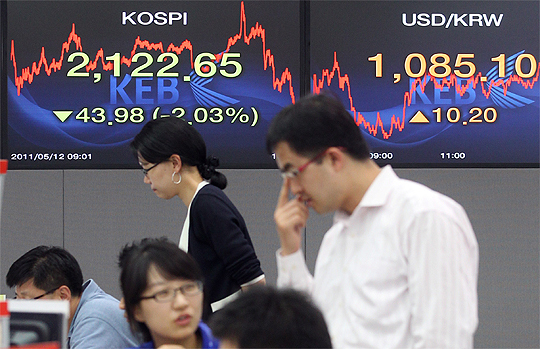 서울 외환시장에서 12일 미국 달러화에 대한 원화 환율이 코스피지수 급락과 글로벌 달러 강세 등의 여파로 3거래일 만에 상승하며 전날보다 10.20원 오른 1085.10원에 거래를 마쳤다. 코스피 지수는 옵션 만기일인 12일 프로그램 매매에서 사상 최대 규모의 매물이 쏟아진 탓에 반등한 지 하루 만에 급락세로 돌아서 전날보다 43.98포인트(2.03%) 하락한 2122.65에 거래를 마쳤다. 사진은 외환은행 본점 외환딜링룸.
