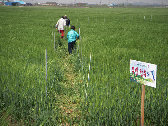 제1회 부안 하서 언독뜰 청보리축제 참가자들이 보리밭 사이에 조성된 무명장수의 길을 걷고 있다. (desk@jjan.kr)
