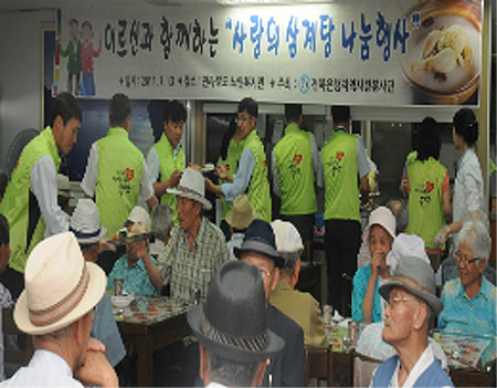 전북은행 지역사랑봉사단은 초복을 앞두고 14일 전라북도 노인복지관무료급식소에서 서신동에 거주하는 불우노인 380명을 초청, 삼계탕을 대접했다.