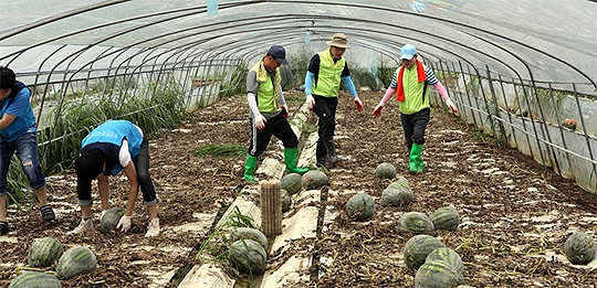 이날 익산센타 김종만본부장 등은 침수피해를 입은 수박비닐하우스에서 수박과 넝쿨제거작업을 하면서 상심해있는 농민들을 위로했다.