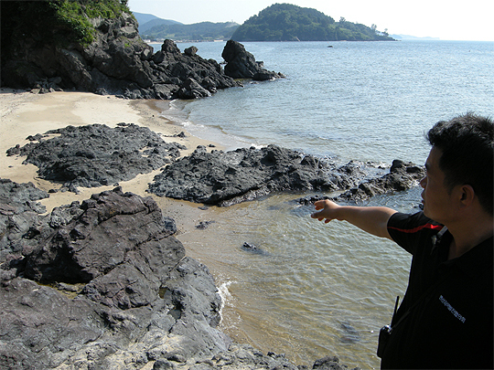 변산지역발전협의회 윤선호 국장이 변산해수욕장 한켠의 모래침식 실태를 설명하고 있다. (desk@jjan.kr)