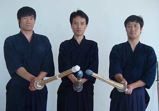 전북 검도 OB팀 김세욱·김기석·김황선 씨(사진 왼쪽부터)가 죽도를 들고 중단 자세를 취하고 있다. (desk@jjan.kr)