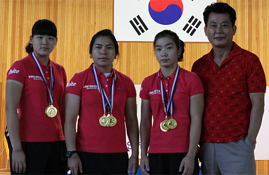 '2011 한국실업역도연맹회장배 역도경기대회'에서 각각 3관왕에 오른 하이트맥주 역도팀 김수미·염옥진·석명아(사진 왼쪽부터)와 김용훈 감독(오른쪽)이 기념 촬영을 하고 있다. 하이트맥주(desk@jjan.kr)