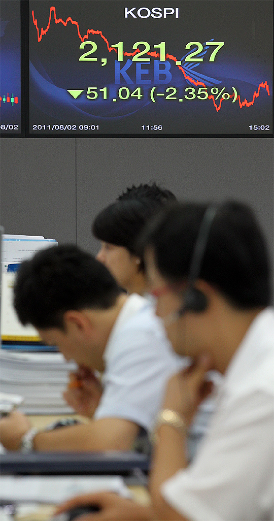 미국 부채협상 타결로 급반등했던 코스피가 더블딥 우려로 폭락했다. 2일 코스피는 전날보다 51.04포인트(2.35%) 하락한 2121.27에 장을 마쳤다. 사진은 이날 오후 서울 중구 명동 외환은행 본점 딜링룸의 모습.