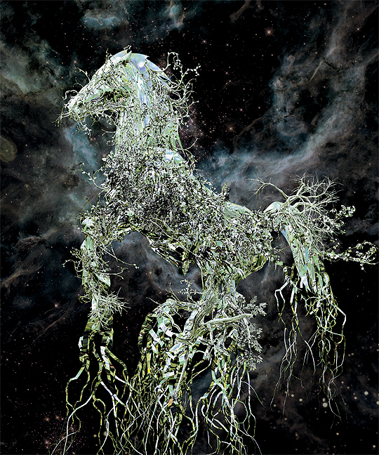 서신갤러리가 선택한 작가는 미디어아티스트 전우진(37). 지난해 세번째로 연 개인전'Complex Universe(복잡한 우주)'의 연장선으로 '재생·부활'에 초점을 맞춰 시간성을 확장시켰다. 말(馬) 형상에 양파 뿌리를 연상시키는 나뭇가지, 나뭇잎 등을 오버랩 돼 시간의 더깨를 형상화했다.