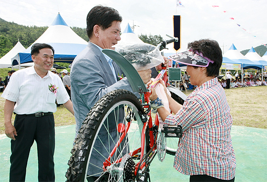 김호수 부안군수가 지난 4일 위도해수욕장에서 열린 위도면민 화합큰잔치에서 한 주민에게 경품을 전달하고 있다. (desk@jjan.kr)