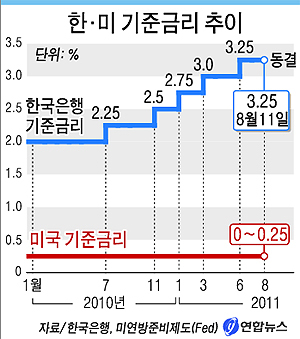 기준금리는 지난해 11월을 기점으로 격월로 인상되면서 2008년 12월 이후 2년3개월만에 처음으로 지난 3월 연 3.0%로 올라선 뒤 석 달만인 지난 6월 연 3.25%로 인상됐다. 이후 두 달째 동결이다.