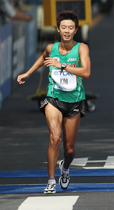 28일 오전대구 국채보상운동 기념공원에서 열린 2011 대구세계육상선수권대회 남자 경보경기에서 김현섭이 6위에 올라 한국 선수 중 처음으로 톱 10에 진입하며 결승선에 들어오고 있다