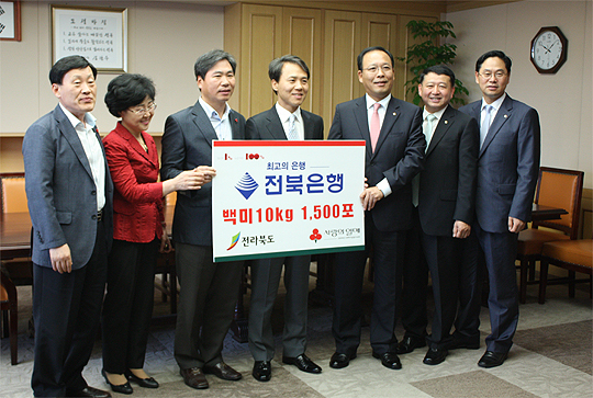 전북은행(은행장 김한)은 7일 추석을 앞두고 전북도청을 방문, 김승수 정무부지사에게 도내 어려운 이웃들에게 전달해 달라며 백미 10kg 1500포(3300만원상당)를 기탁했다.