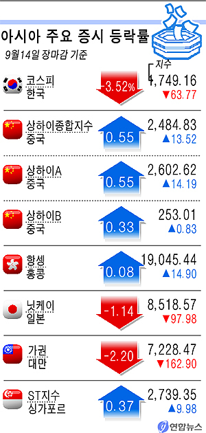 아시아증시가 14일 유럽발 위기로 동반 급락했다.