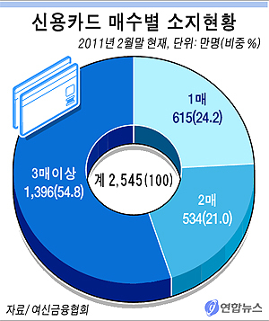지난 2월 말 현재 3장 이상 신용카드 소지자는 전체 카드 소지자의 54.8%인 1천396만명, 2장 소지자는 21.0%인 534만명이었다. 이에 따라 이달부터 카드사 간의 정보공유 회원 비중이 전체 카드소지자의 75.8%(1천930만명) 수준까지 본격적으로 확대돼 신용카드의 건전성 관리가 가능해질 전망이다.