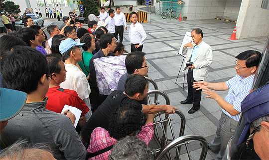 18일 오후 영업정지된 인천시 남동구 구월동 에이스저축은행 본사 후문 앞에서 예금자들이 예금자 설명회에 대한 금융위 관계자의 안내를 듣고 있다. 연합뉴스(desk@jjan.kr)