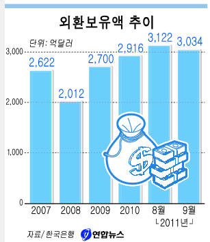 지난달 말 우리나라 외환보유액이 3천억달러를 겨우 턱걸이했다.