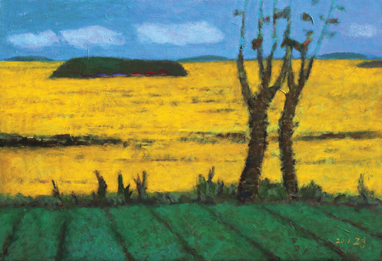 어릴적부터 넓은 평야와 아름다운 바다를 가슴에 안고 살아온 그에게 고향인 부안의 산과 바다, 들판은 화폭의 힘이 된다. 그에게 '산'은 사철 풍광 아름답고 풍요로운 곳. 언젠가 보았던 것 같은 친근감 있는 '산'을 그려왔다. 1960년대 야수파로 분류되는 실험적인 양식을 추구해오던 그가 1970년대부터 2000년대까지 '산'을 주제로 구상과 추상, 전통성과 현대성, 강함과 유연함 사이에서 자신만의 독특한 화풍을 구축해온 변천사를 살펴볼 수 있다. 군더더기 없는 단순화된 형상으로 기억을 화폭으로 재구성하는 '산'은 여백의 아름다움이 강하게 느껴진다. 줄기차게 '산'만 그려왔던 그는 이번에 벼 익어가는 '황금 벌판'도 내놓았다.