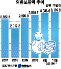 2일 한국은행에 따르면 2011년 10월 말 현재 우리나라의 외환보유액은 3천109억8천만달러로 전월 말 3천33억8천만달러보다 76억달러(2.5%) 늘어났다. 지난 4월 중 85억8천만달러 이후 최대 증가액이다.