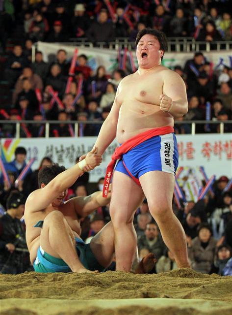 ▲ 전국 씨름, 군산서 포효하다…24일 군산 월명체육관에서 벌어진 2012년 설날씨름대회 백두장사 결정전 첫판에서 전북출신 장성복이 이슬기를 이긴 뒤 기뻐하고 있다. 하지만 장성복은 2-3으로 패해 아쉬움을 남겼다. 연합뉴스