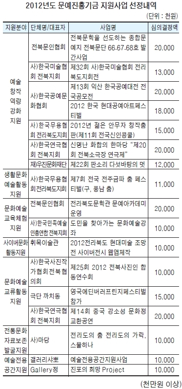 1000만원 이상 사업으로는 △전북민술협회 회원전 △한국 현대공예아트페스티벌 젊은 안무자의 창작콩쿨 △우진문화재단 판소리다섯바탕의 멋 △전북무용협회의 금파춤 페스티벌 △전북민예총 문화예술강좌 △휘목미술관의 전북현대미술조망전 사이버전시웹앱제작 △전북사진작가협회의 사진인합동연수회 △극단까치동의 영국에딘버러프린지페스티벌 참가 △사단법인 마당의 전라도춤 전라도 가락 등이 있다. 예술전용공간 지원사업으로 갤러리 사뽀와 갤러리 정이 각각 1000만원을 지원 받는다.
