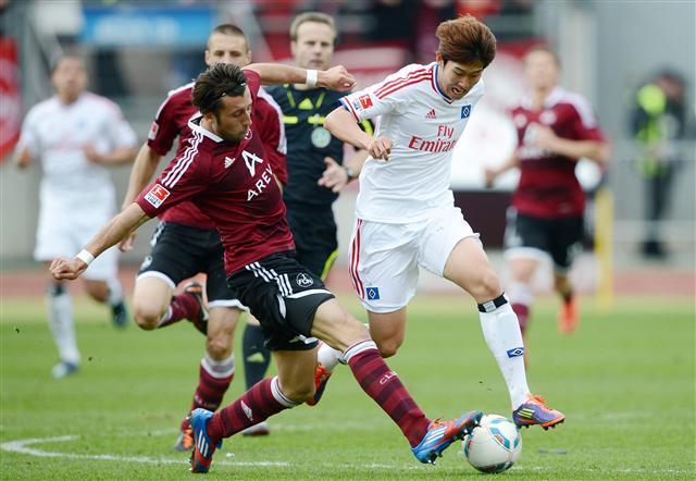 ▲ 독일 프로축구 분데스리가 함부르크와 뉘른베르크의 경기에서 함부르크의 손흥민이 뉘른베르크의 도미닉 마로와 볼을 다투고 있다. 연합뉴스