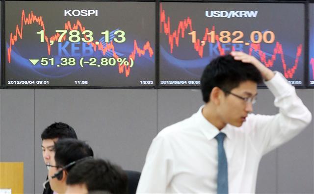 4일 유가증권시장에서 코스피는 전 거래일보다 51.38포인트(2.80%) 하락한 1783.13으로 마감했다. 장중 한때 1776.85까지 하락하며 연중 최저치를 갈아치웠다.