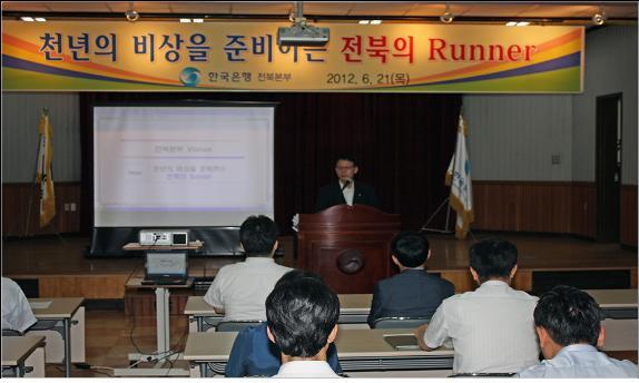한국은행 전북본부는 지난 12일 창립 제62주년 기념 포상에서 최우수상을 수상한 것을 계기로 지역경제 발전에 실질적으로 기여할 수 있는 방안을 제시하고 지역사회와 함께하는 지역 소재기관으로 거듭날 것을 다짐하며 21일 전직원의 의지와 향후 업무추진 기본계획을 담은 '천년의 비상을 준비하는 전북의 Runner'라는 비전을 선포했다.