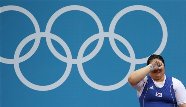 ▲ 장미란이 5일 오후(현지시간) 영국 런던 엑셀 아레나에서 열린 2012 런던올림픽 여자 역도 75㎏ 이상급 경기에서 용상 3차시기에 170kg을 들어올리다 실패한 뒤 아쉬워하고 있다.