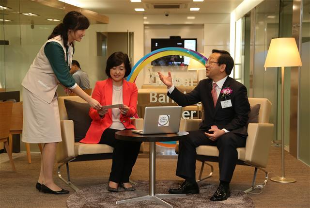 하나은행 김종준 은행장(오른쪽)이 17일 오전 서울 강남구 삼성동 하나은행 글로벌 뱅킹 센터에서 열린 개점식에서 직접 고객상담을 하고 있다. '글로벌 뱅킹 센터'개점을 기점으로 하나은행은 해외 유학생 및 이주자, 해외 이민고객 또는 국내로의 역이민고객, 외국인 등을 대상으로한 전문서비스를 시작한다고 밝혔다. 연합뉴스