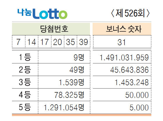 당첨번호 6개를 모두 맞힌 1등 당첨자는 9명으로 14억9103만원씩 받게 된다.