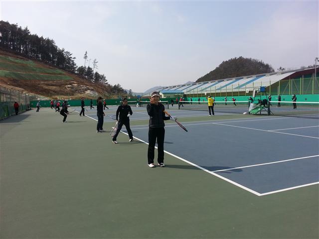 ▲ 25일 순창공설운동장에서 열린 '2013년 순창 한국실업정구연맹 동계리그전'에서 몸을 풀고 있는 선수들.