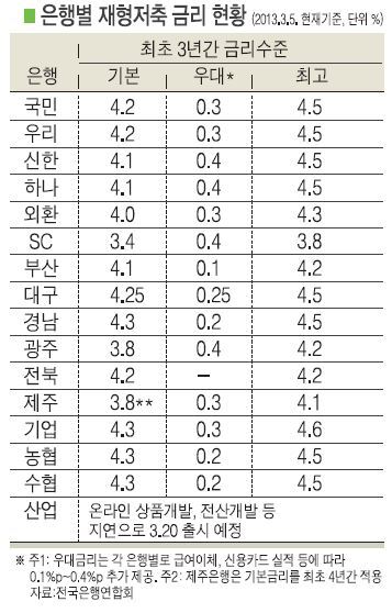 실제 각 은행들이 제시한 기본금리(최초 3년간)는 3.8(제주은행)~ 4.3%(경남·기업·수협은행)이지만 각 은행별로 적용하는 우대금리(0~0.4%)를 합산하면 최고 금리가 각 은행별로 3.8(SC은행)~4.6%(기업은행)의 분포를 보인다.
