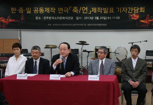 일본국제교류기금과 아오모리현립미술관이 주축으로 제작한 연극'축/언'(祝/言)은 재난 현장에서의 예술가의 역할에 관한 화두를 던지는 작품이다. 20일 오전 11시 한국소리문화의전당 전시실에서 열린 제작 발표회에서 만난 연출가·배우들은 "예술의 사명은 절망에 빠진 일본인들에게 다시 살아나갈 힘을 주입하는 것"이라면서 "3개국이 상처를 어떻게 극복할 것인가에 관한 고민을 바탕으로 작품을 만들고자 했다"고 소개했다.