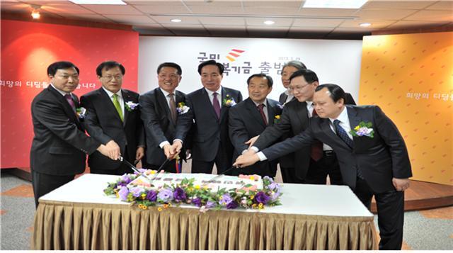 ▲ 지난 29일 한국자산관리공사(캠코) 전북지역본부 2층 강당에서 열린 '국민행복기금 전라북도 출범식'에서 참석자들이 축하 케이크를 자르고 있다.