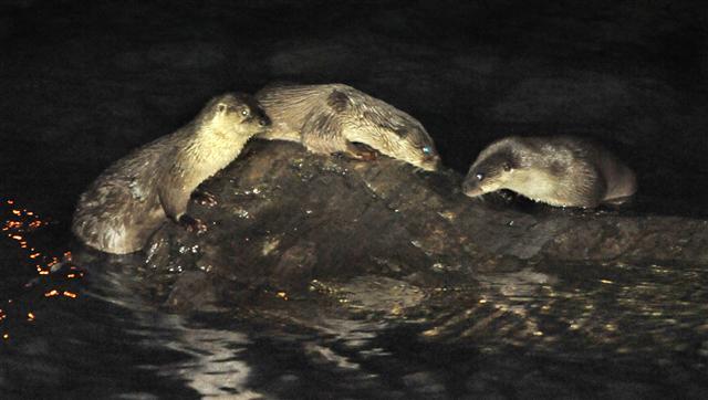 이틀간에 걸친 잠복 끝에 카메라 렌즈에 담은 전주천 수달. 사진이 좋지 않아 다시 10여차례의 시도 끝에 지난 2008년 4월 짝짓기하는 한 쌍을 촬영했다. 다시 8개월이 지난 2009년 2월 오전 3시. 며칠째 잠복 끝에 수달 가족이 바위에 앉은 모습을 카메라에 잡았다. 수달 가족이 전주천에서 서식하는 모습이 지난 2008년과 이듬해 전북일보 지면을 통해 생생하게 드러났다.