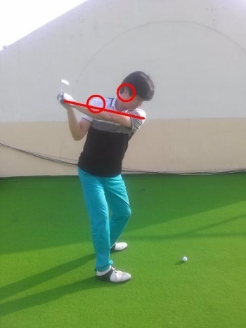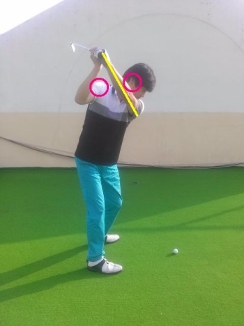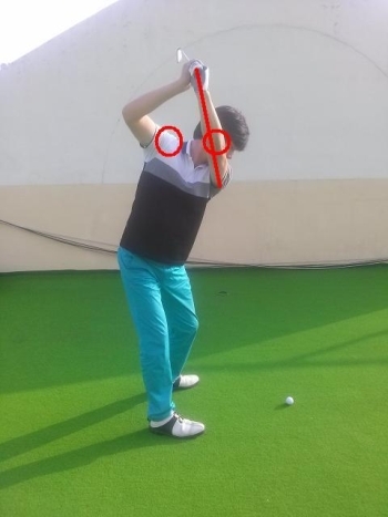 왼팔의 위치가 사진2와같이 높게 올라가면 업라이트 스윙이 되어 클럽 스피드가 줄게 되고 당겨 치는 동작이 쉽게 나와 슬라이스가 많이 나기 마련이다.