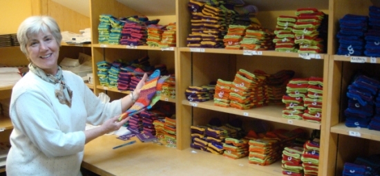 ▲ 솔메이트삭스의 창립자인 마리안느 워카린씨가 헌옷에서 뽑아낸 실로 만든 양말을 들어 보이고 있다.