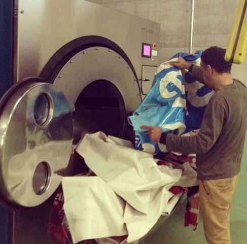 ▲ 프라이탁 직원들이 가방의 원재료가 되는 트럭용 방수포를 세탁하고 있다.