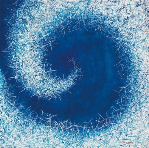 구체적인 형태보다는 단순한 모양과 간략한 구도를 선택해 생명의 기원과 우주의 조화를 쏟아놓았다는 게 작가의 설명이다. 에너지의 흐름과 조화를 양과 음이 만난 마름모 또는 원 속에서 생명의 에너지인 희미한 씨앗들이 소용돌이 치며 그 역동성을 밝은 빛의 터치로 구현했다.