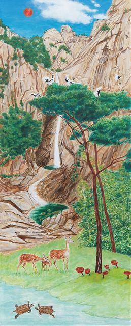 전통 민화에 등장하는 가장 한국적인 십장생을 가장 서구적인 아크릴과 유화물감으로 부활시키는 그만의 독특한 작품세계를 만날 수 있다.