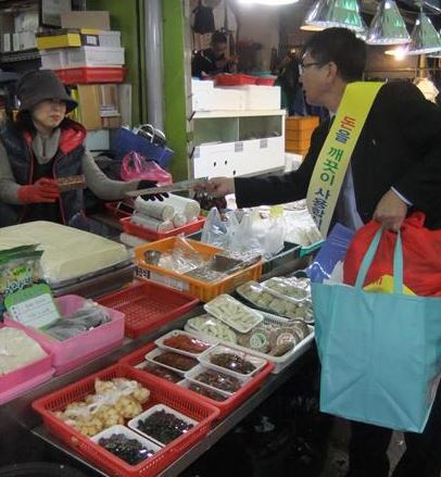 ▲ 한국은행 직원들이 18일 전주 모래내시장 주변에서 위조지폐 확인방법 가두캠페인을 하고 있다.