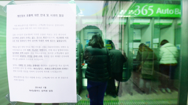 ▲ KB국민·롯데·NH농협카드 개인정보 유출과 관련하여 카드 재발급 및 해지등을 신청하려는 고객들이 늘고 있는 가운데 21일 전주 한 은행에 사과문이 붙어 있다. 추성수기자 chss78@