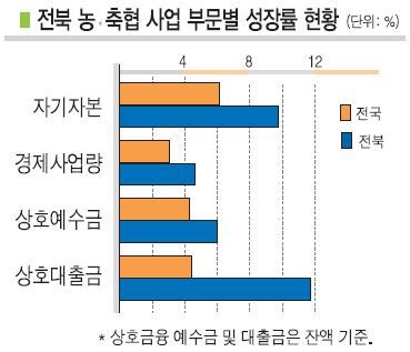특히 상호금융대출금은 전년보다 7,133억원이 증가한 6조7500억원을 달성해 전년보다 12% 성장하며 전국 1위의 성적을 거뒀다. 전국 지역 농·축협의 대출성장률이 3~5%인 점을 감안할때 두드러진 실적으로 농식품기업자금과 영농시설자금 등 생산자금지원이 크게 증가한 때문으로 분석되고 있다.