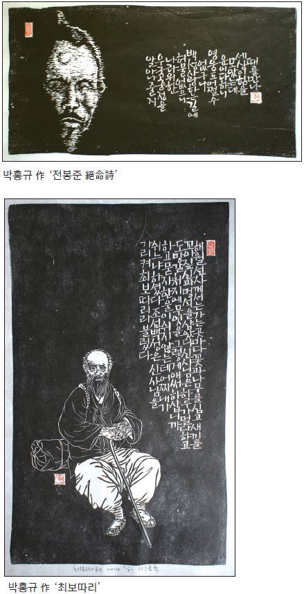 2주갑을 맞은 동학농민혁명의 콘텐츠가 ‘농민화가’ 박홍규씨(55)에 의해 더 살찌워졌다. 그간 회화와 만화를 넘나들던 박 씨가 첫 판화전을 열고 있다(29일까지 전주 복합문화공간 차라리언더바). ‘전녹두, 어서 오게나’를 주제로 건 그의 전시회에는‘최시형 선생 像’‘전봉준 절명시’‘후천개벽도’등 동학농민혁명 120주년을 형상화한 작품과, 농민으로 살아온 30여 년의 삶과 투쟁에 관한 판화, 틈틈이 제작한 섬진강풍경,‘흑룡도’를 비롯한 부적판화 등 30여 작품이 출품됐다.