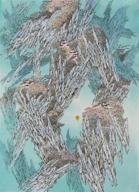 흑운모처럼 방향성을 지니고 쪼깨짐이 있는 그의 바위는 화면을 지그재그로 가르며 역동성을 부여한다. 각각의 바위는 작은 단위의 집합체가 모여 보다 다 큰 규모를 형성하는 사회의 프랙탈 구조를 상징한다. 사회의 피라미드화된 계층 질서의 견고함 속에서도 생명은 씨를 내리고 어울리며 살아가는 모습이 바위 사이사이에 담겼다. ‘바위산수’나 ‘중첩-몽유도원도’와 같은 작품에서는 음양이 조화로운 산수화의 안락함보다는 뾰족하고 날카로움 속에 사는 현대인의 위태로움과 안타까움이 먼저다. ‘중첩-동풍을 기다리며’에서는 열기구라는 소품을 배치해 이상향으로 비상하고 싶은 소망을 나타내기도 했다.